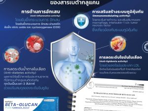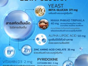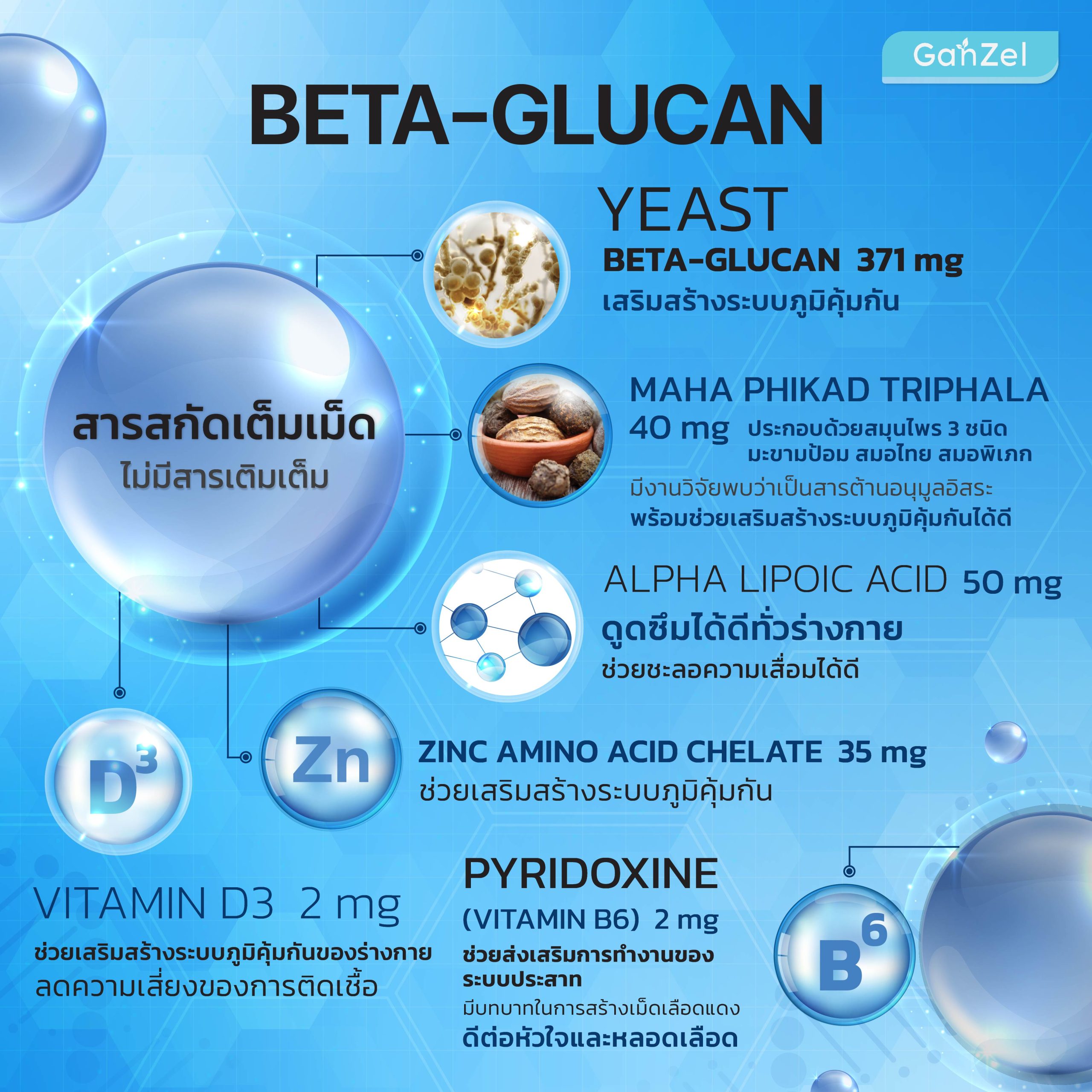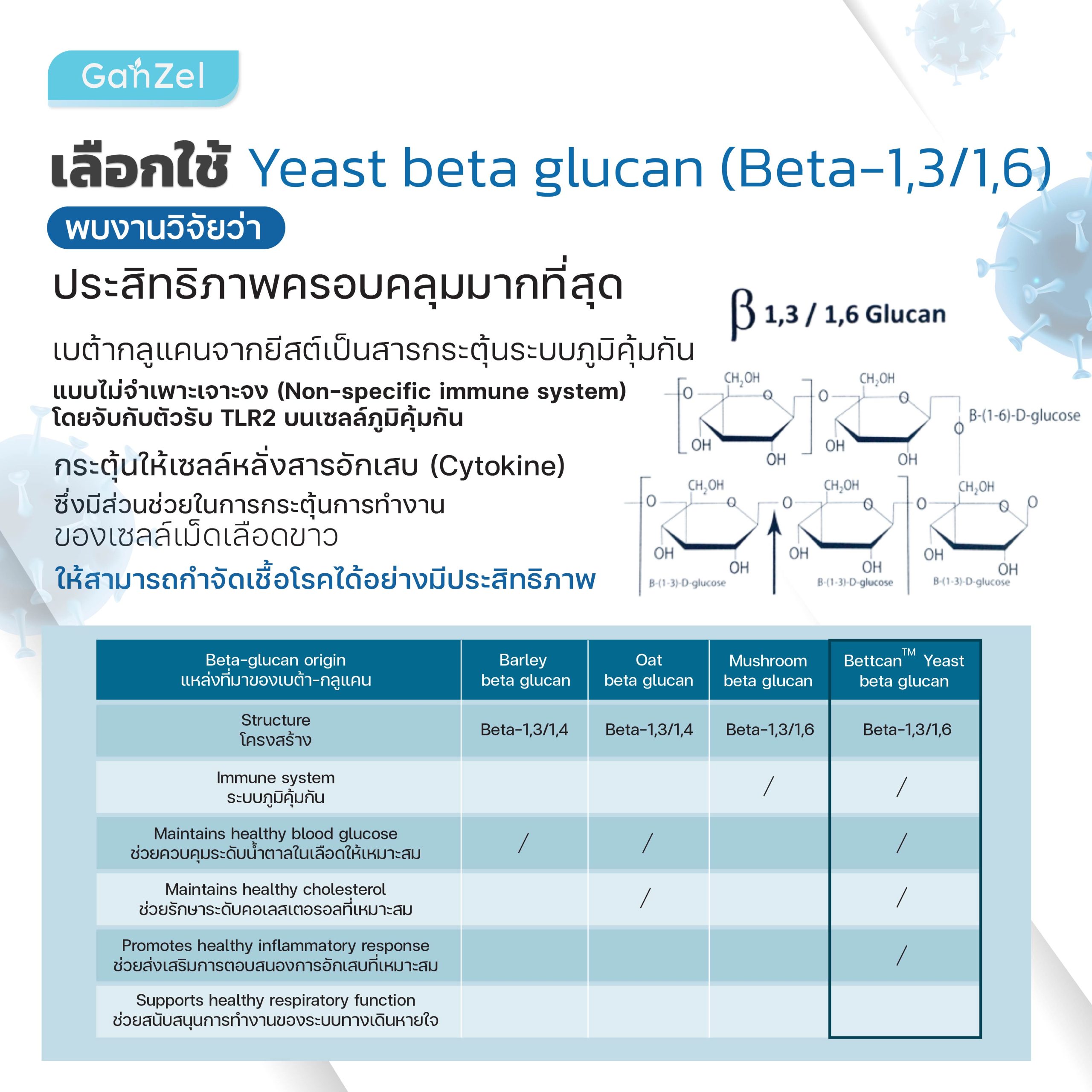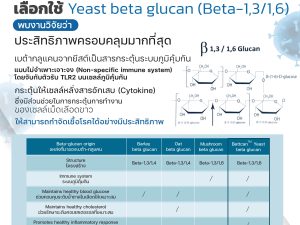 YEAST BETA-GLUCAN : สกัดจากผนังเซลล์ของยีสต์ซึ่งเป็น Yeast beta Glucan ชนิด Saccharomyces cerevisiae มีโครงสร้างโมเลกุลที่เป็นแบบ Beta1,3/1,6-Glucan ซึ่งช่วยเรื่องการเสริมสร้างภูมิคุ้มกันได้ดีที่สุด