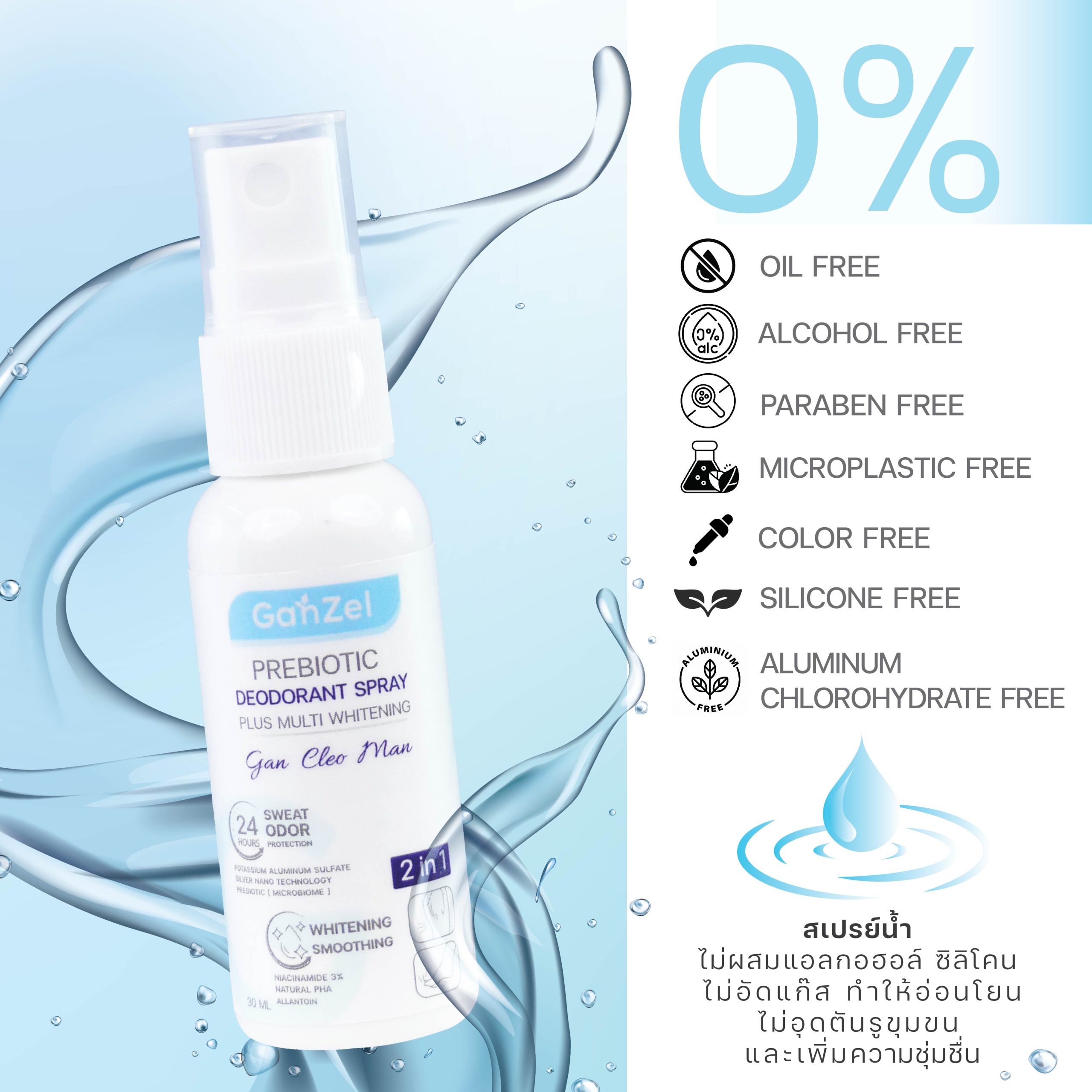 - ไม่มีสารอุดตันรูขุมขน และอุดตันต่อมเหงือ เช่น ซิลิโคน และอลูมิเนียม คลอโรไฮเดรต ซึ่งพบทั่วไปในผลิตภัณฑ์ระงับกลิ่น