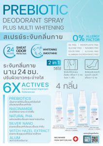 - ฉีดพ่นบริเวณใต้วงแขน ข้อพับ เพื่อระงับกลิ่น ครั้งละ 1-2 กด วันละ 1 ครั้ง
