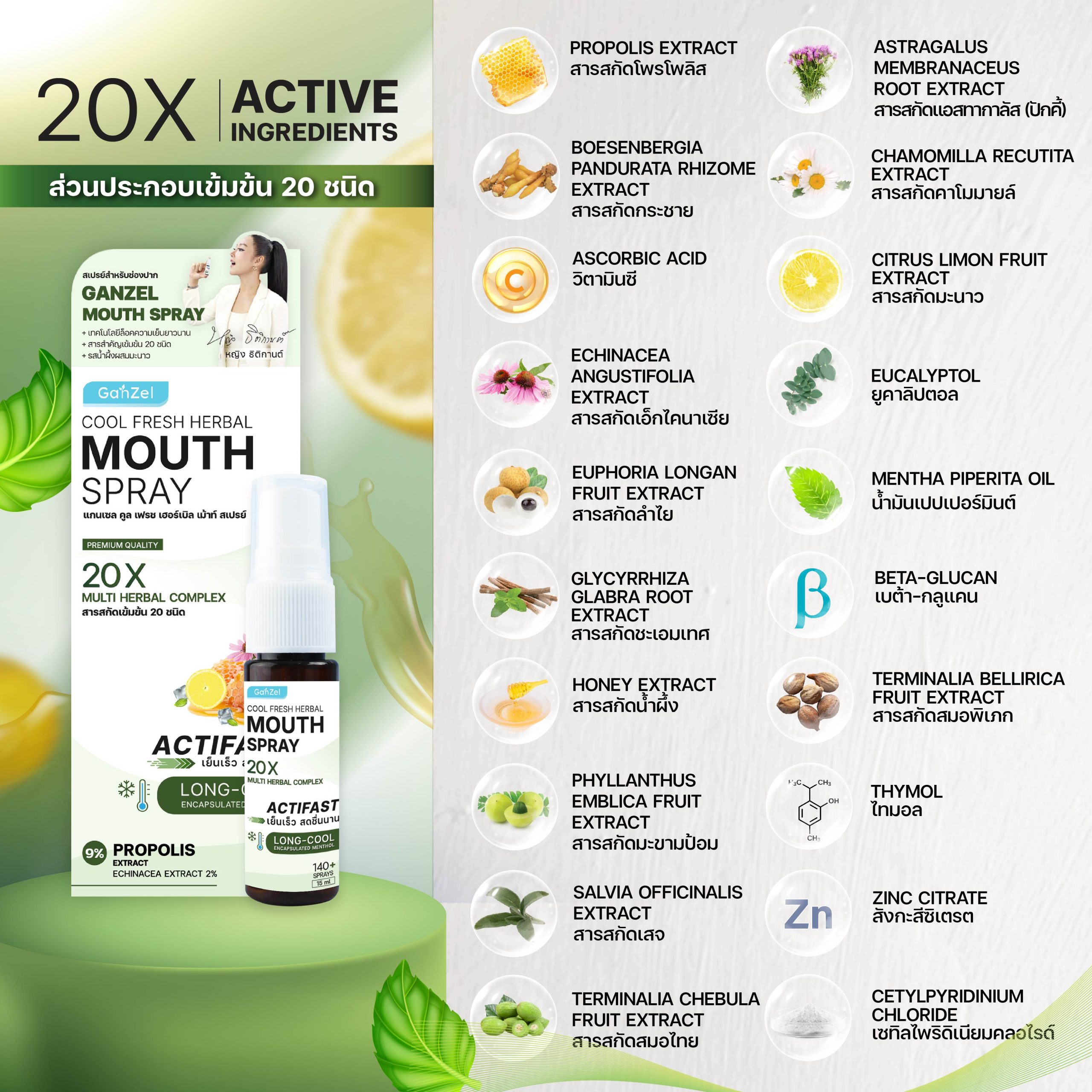 EUPHORIA LONGAN FRUIT EXTRACT, SALVIA OFFICINALIS EXTRACT, CHAMOMILLA RECUTITA EXTRACT, ASCORBIC ACID, HONEY EXTRACT, CITRUS LIMON FRUIT EXTRACT, EUCALYPTOL, MENTHA PIPERITA OIL, THYMOL AND OTHER.