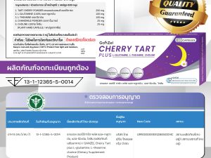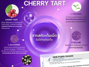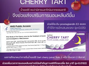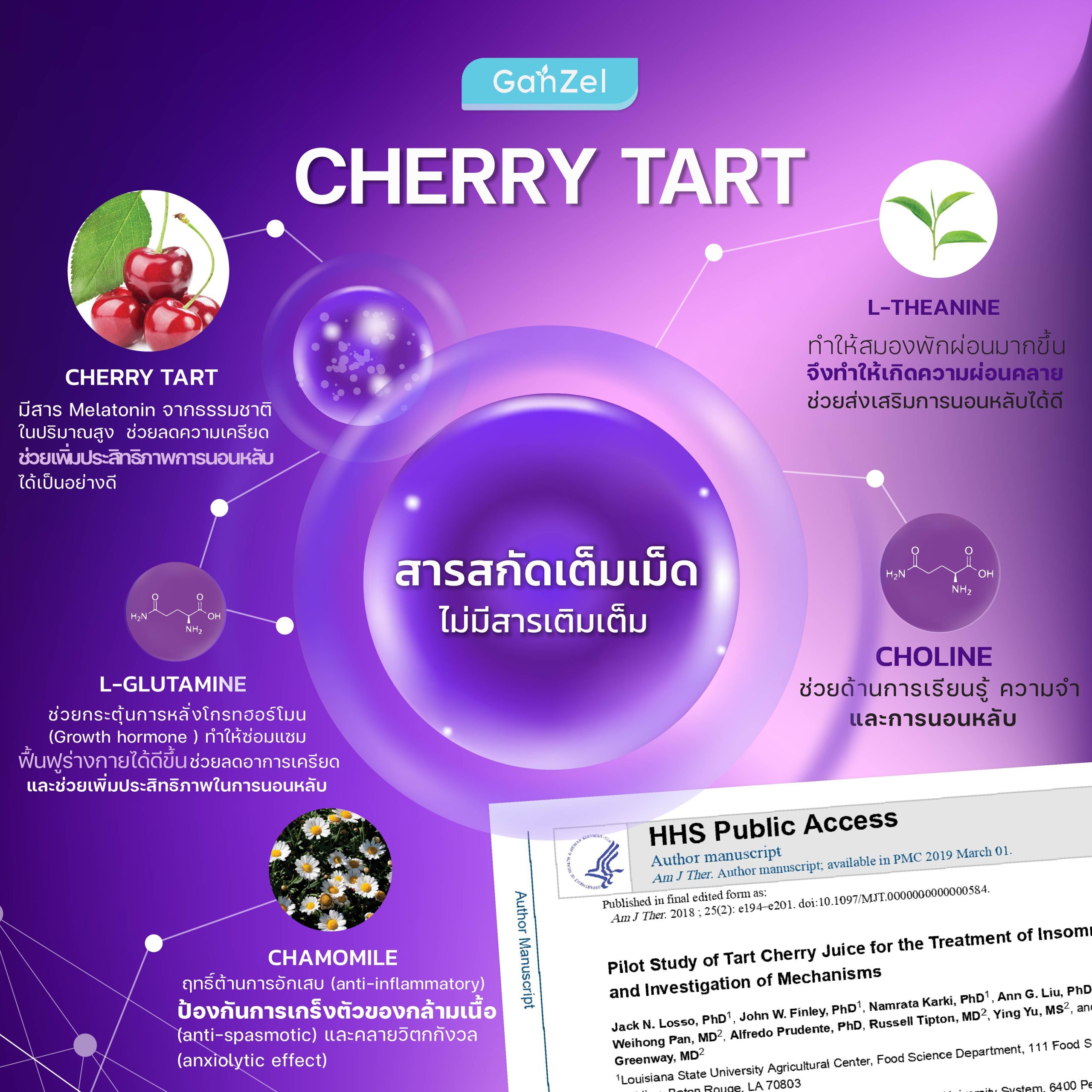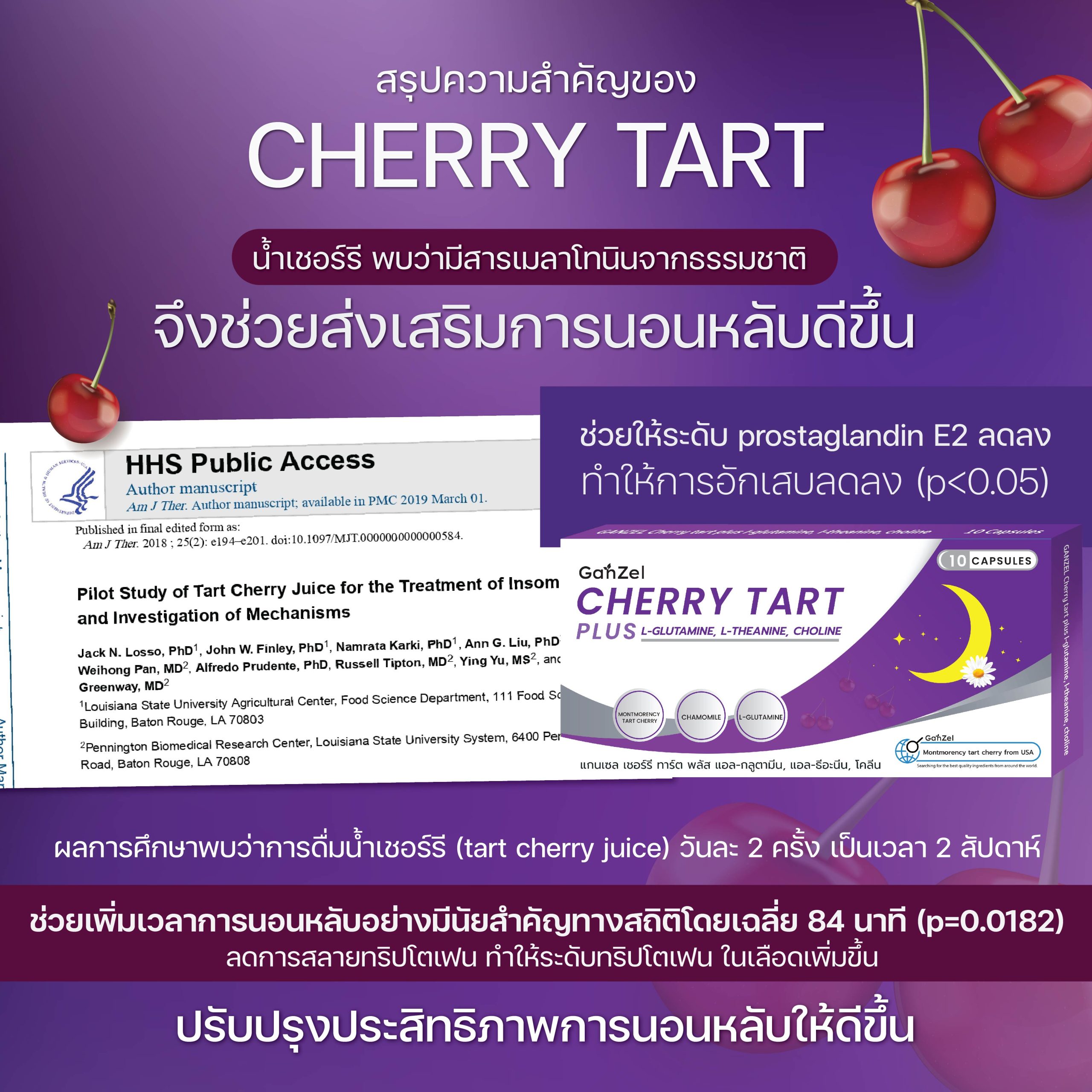 CHERRY TART : เชอร์รี่ ทาร์ต มีสารสําคัญ Anthocyanin และ Melatonin ซึ่งจะช่วยต้านอนุมูลอิสระ เพิ่มการไหลเวียนของโลหิต ช่วยฟื้นฟูกล้ามเนื้อ ช่วยลดความเครียด และช่วยเพิ่มประสิทธิภาพการนอนหลับได้เป็นอย่าง