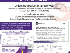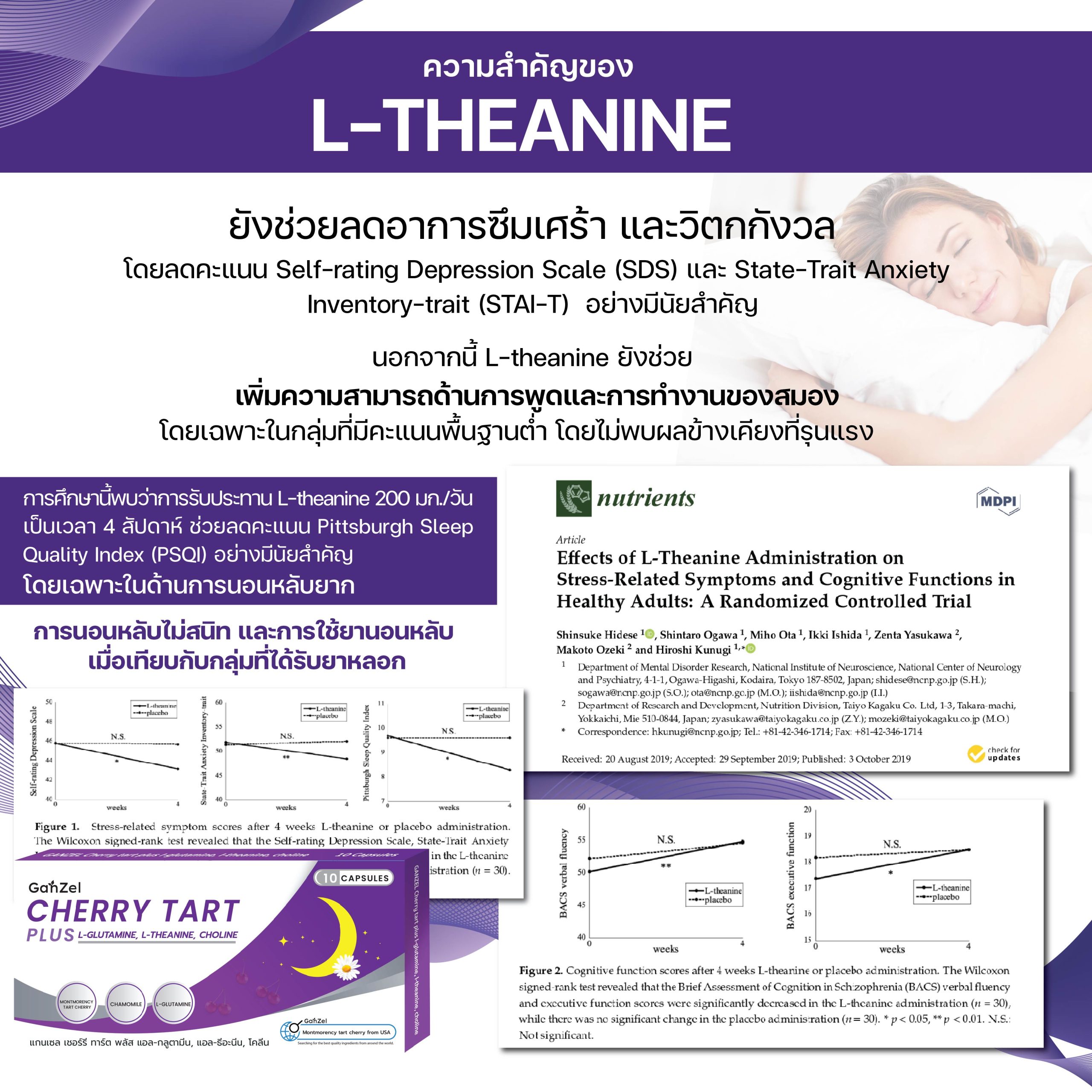 L-THEANINE : สารธีอะนีนสามารถดูดซึมเข้าสู่กระแสเลือดไปยังสมองได้ดีภายในเวลา 30 นาที ส่งผลให้สมองปลดปล่อยคลื่น Alpha Brain Wave มากขึ้น และลดการปลดปล่อยคลื่น Beta Brain Wave ทำให้สมองพักผ่อนมากขึ้นนอกจากนี้ยังพบว่าสามารถเพิ่มสาร Serotonin, Dopamine,Gaba จึงทำให้เกิดความผ่อนคลาย ช่วยส่งเสริมการนอนหลับได้ดี